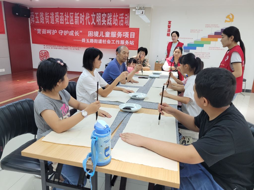 在深入走访调研的过程中,社工们发现这些孩子不仅面临着经济上的拮据,更在精神层面缺乏成长的支持与陪伴。他们或受身体条件限制,或因生活环境封闭,导致兴趣爱好难以发展,心灵世界亟待丰富。基于此,舜玉路街道社工站精心策划了此次书法教育小组活动,通过笔墨的魔力,为孩子们打开一扇通往艺术与心灵的窗户。