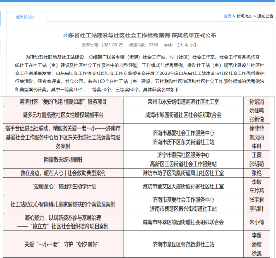 近日,2023年度山东省社工站建设与社区社会工作优秀案例征集大赛结果公布。曹范街道民政社工站申报的关爱“一小一老”,守护“朝夕美好”服务项目荣获三等奖,也是章丘区唯一获奖项目。