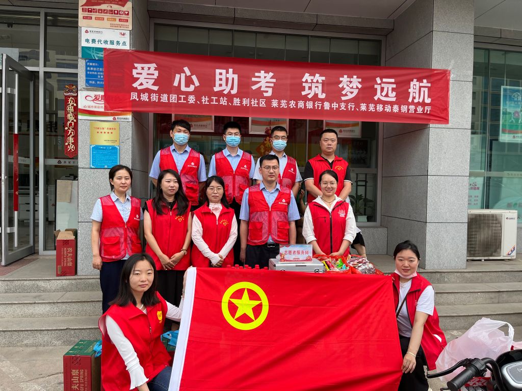 “莘莘学子十年寒窗,功成名就只待今朝”。一年一度情系万家的高考开始了,为给广大考生和家长营造一个便捷舒适的候考环境,6月7日上午凤城街道社工站联合凤城街道团工委、凤城街道胜利社区、莱芜农商银行、莱芜移动泰钢营业厅在济南市莱芜区第十七中学门前共同举办了以“爱心助考-筑梦远航”为主题的志愿服务活动,开展对参加高考的广大学子及等候学生的家长献爱心服务。