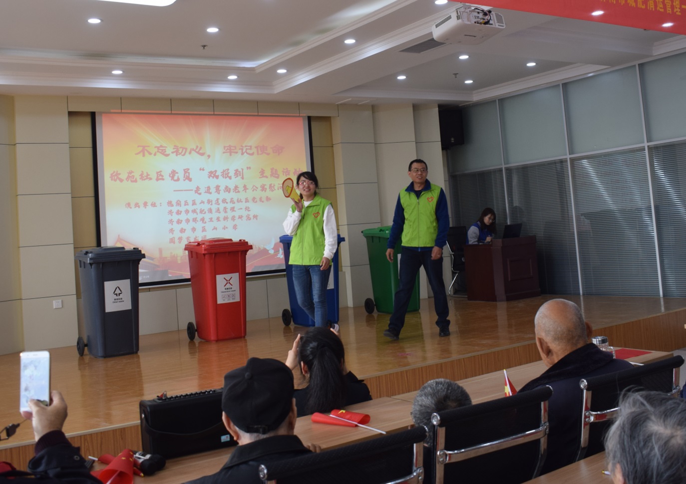 上午九点,济南市科学卫生研究所的垃圾分类宣讲员们走进槐荫区社会福利服务中心,联合项目组社工以生动有趣的方式向住养老人们传达了垃圾分类的理念和知识。志愿者们首先向老人介绍了垃圾分类的意义,有些老人不认识字,理解能力差,社工和志愿者耐心解释,确保在场的每位老人都能明白垃圾分类对社会和个人的福祉密切相关。然后,志愿者们以小品的方式宣传了垃圾分类的具体知识,包括干垃圾和湿垃圾的分类等。老人可能一时不会那么清楚,社工在后续工作中要起到引导和宣传的作用,这是一件需要长期坚持的事情。养老院每天会产生许多医疗、生活及厨余垃圾,做到垃圾分类是非常有必要的。