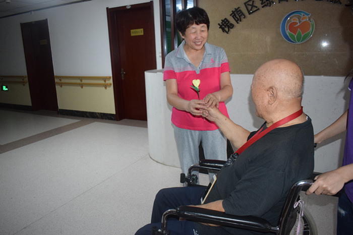 吴爷爷今年88岁,坐轮椅,口齿不清,听力衰退。社工是通过一次小组活动才注意到这位老人。记得一次活动中,这位爷爷应该是第一次参加活动,来的相对较晚,坐在了最边缘位置,社工上前了解情况,老人并没有回应,还以为是护理人员推来参加活动的,但之后几次活动都能看到这位爷爷的身影,社工感到好奇,了解才知,是这位爷爷告诉护理人员有唱歌活动时候把他推到活动室。社工得知后,有活动都会去叫这位爷爷,几次活动下来,社工走访时还能听见爷爷自己在房间内唱歌。今天的手工活动爷爷居然也来参加了,回去的时候还把自己做的手工作品,送给了自己楼层的护理人员。