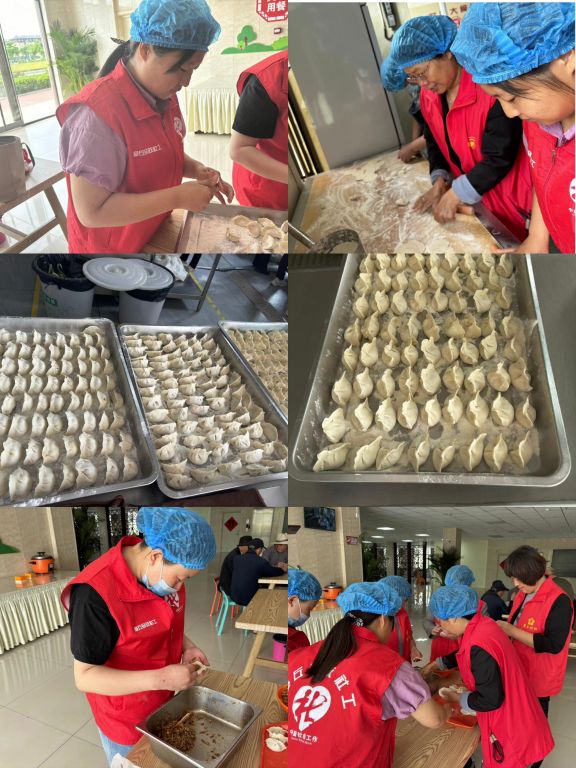 利用表演节目的时间社工和志愿者们在厨房为残疾人制作手工水饺,你拌馅子我擀皮,一个个圆鼓鼓的水饺从志愿者的手中诞生。观看完精彩的演出后,一盘盘香喷喷的饺子端上餐桌,残疾人品尝着美味可口的饺子,大家有说有笑,现场气氛其乐融融。