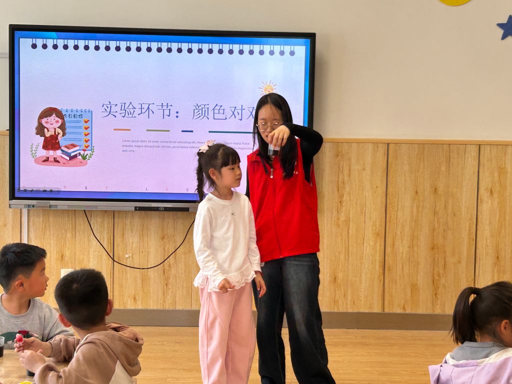 活动以趣味“变色魔术”开场,社工在清水中加入依次红黄蓝色素后变幻出缤纷色彩,迅速点燃孩子们的好奇心。与此同时,社工借助多媒体,以生活中常见的彩色印刷、绘画调色为例,简明讲解色彩混合的基本原理,帮助儿童建立“色彩碰撞产生新可能”的认知。实验环节中,孩子们分组使用滴管、量杯等工具,将红与黄、蓝与绿等颜色两两混合,观察到橙、紫、青等新色彩的诞生,并为自己调配的颜色起了“阳光橙”“星空紫”等充满童趣的名字。社工全程指导安全操作,引导孩子们记录颜色变化细节,鼓励大胆尝试粉色与绿色、蓝色与橙色等创意组合,探索不同比例下的色彩效果。最后,成果展示时,各组将配色作品陈列在“彩虹展板”上,代表们分享配色思路:“黄色加蓝色像春天的小草,所以叫‘嫩芽绿’!”社工通过互动提问,帮助孩子们总结“颜色比例不同会影响混合结果”等发现,加深对科学原理的理解。