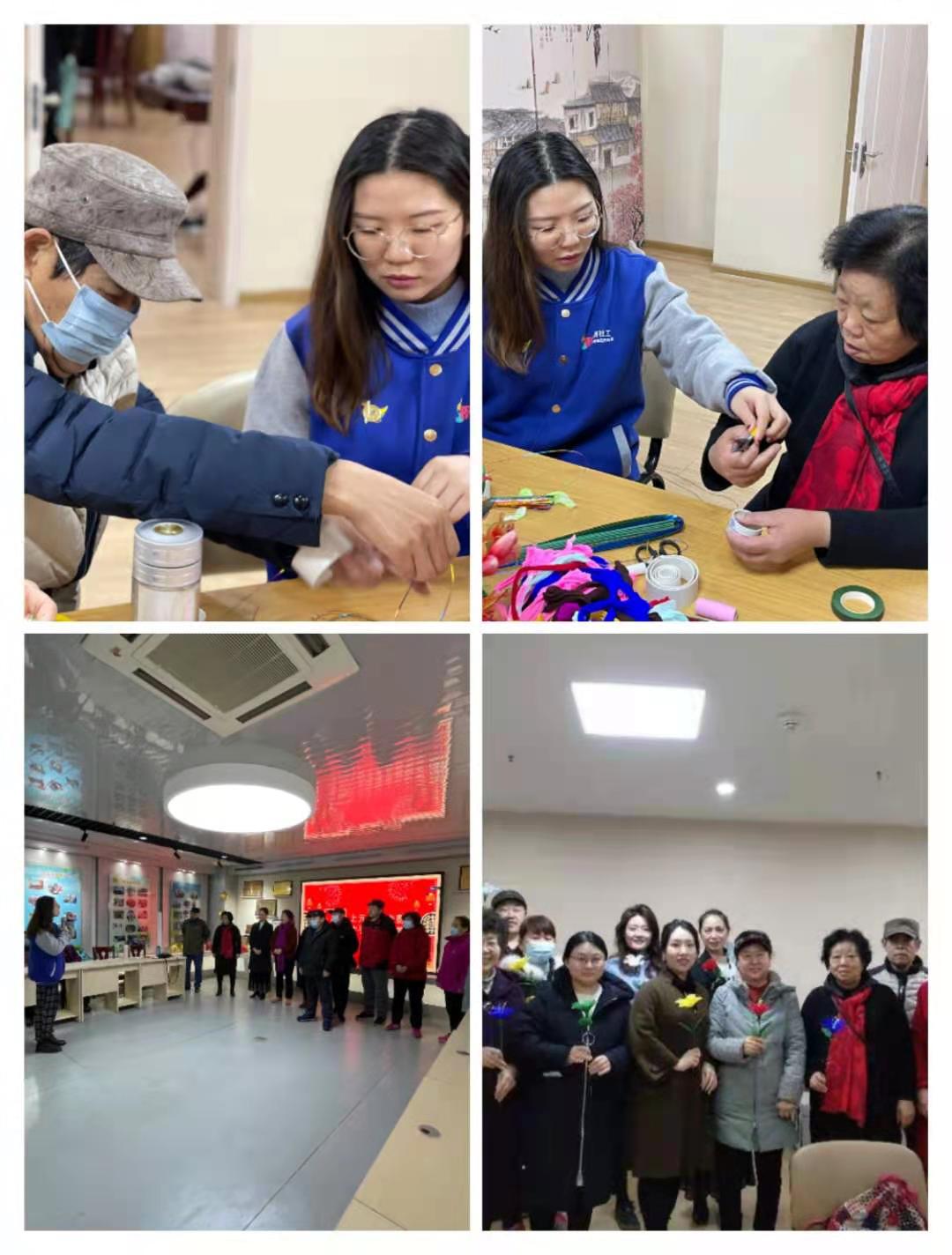 上午九点,老人们陆续来到了活动现场进行签到。活动伊始,社工带领老人们进行热场小游戏——“桃花朵朵开”,老人们沉浸其中,乐不思蜀,现场呈现出一片热闹非凡的氛围。游戏过后,由欣园社区夏雪主任进行致辞,回顾过去一年社区开展的各项工作,并对新一年工作进行展望。之后,社区邀请到志愿者庞老师带领大家进行丝网花制作活动,社工予以协助,使老人们从对于对丝网花制作的陌生到逐渐熟练地绑好一片片花瓣,最后缠绕成花朵,看着一朵朵五颜六色的花,老人们都非常开心。