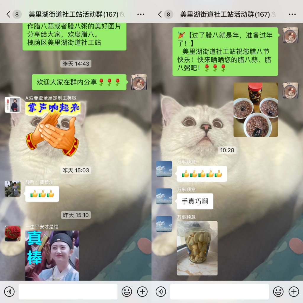 “时逢腊八望云寒,豆粥飘香供早餐。交岁过年从此启,俗风延续向平安。”腊八节,俗称“腊八”,不仅有喝腊八粥、腌腊八蒜的习俗,也有祈求丰收吉祥的传统。腊八到了,新年的脚步也越来越近,美里湖街道社会工作服务站(以下简称“社工站”)邀请辖区居民朋友开展腊八节线上分享活动,共同感受节日氛围,缓解疫情带来的心理压力,加强邻里之间的交流互动,提升社区参与感。