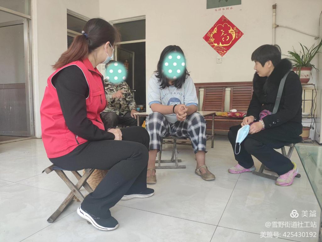 2022年5月13日,雪野街道社工站三名社工成员与雪野街道妇联主席交流后,一同来到南圈村,在村妇女主任带领下,来到女生家中,社工与妇联主席坐在女生身边,问其辍学缘由,并苦口婆心的劝其回归校园,同时与其讲解未完成学业在今后的工作生活中的影响,女生并不怎么说话,只是笑笑,但态度十分坚决,不肯回归校园。