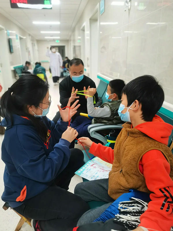 玩绘画涂色,折飞机和小船,小朋友与家长玩翻绳……走进山东省立三院儿科输液室,与想象中吵吵嚷嚷、哇哇大哭的情况不同,这样“欢乐”的场景甚至让人以为走进了“幼儿园”。