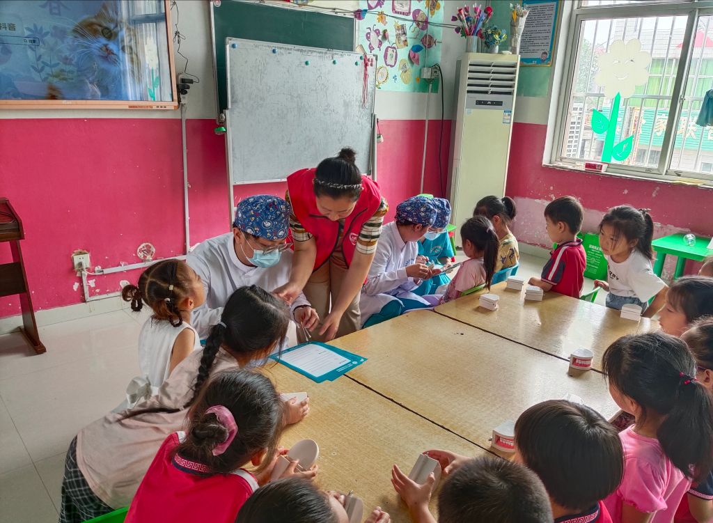 讲解结束后,在社工的协助下,医护人员对孩子们进行全面、细致的口腔检查,登记好每位小朋友牙齿长虫牙的位置和数量,并将检查结果交到老师手上,同时针对检查结果提出相应的指导意见。