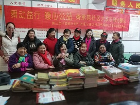 舜承苑社区大家乐阳光舞蹈队用舞蹈传递快乐,用舞蹈带动健康,用舞蹈践行公益。11月28日,萤火虫项目组社工联合舜承苑社区大家乐舞蹈队在社区会议室开展爱心捐书活动。