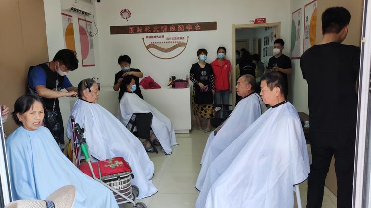 老人们一边理发,一边开心地与社工交流:“真的太感谢你们了,一心为我们着想,上门为我们免费理发,我们既不用跑远路还省了钱,为我们解决了大问题。”一个大爷率先理好了,大家一致称赞:“啧啧,真帅气。”大爷开心地对着相机比起了剪刀手。