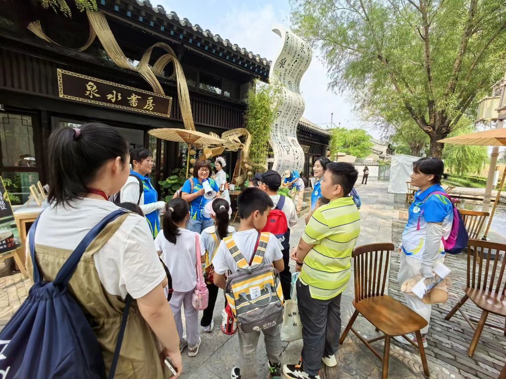 在这个阳光斑驳的下午,一群活泼可爱的孩子们穿过美丽的百花洲,与老济南纪念馆的志愿者们汇合,在志愿者们的讲解下,了解了李清照来到百花洲触景生情而创造出来的《如梦令》,在志愿者带领下,孩子们一起回忆背诵了这首极具韵味的词章,路过碧筒饮的雕塑,讲解员生动描述了古人如何把荷叶当作盛酒容器,小朋友听的不亦乐乎。