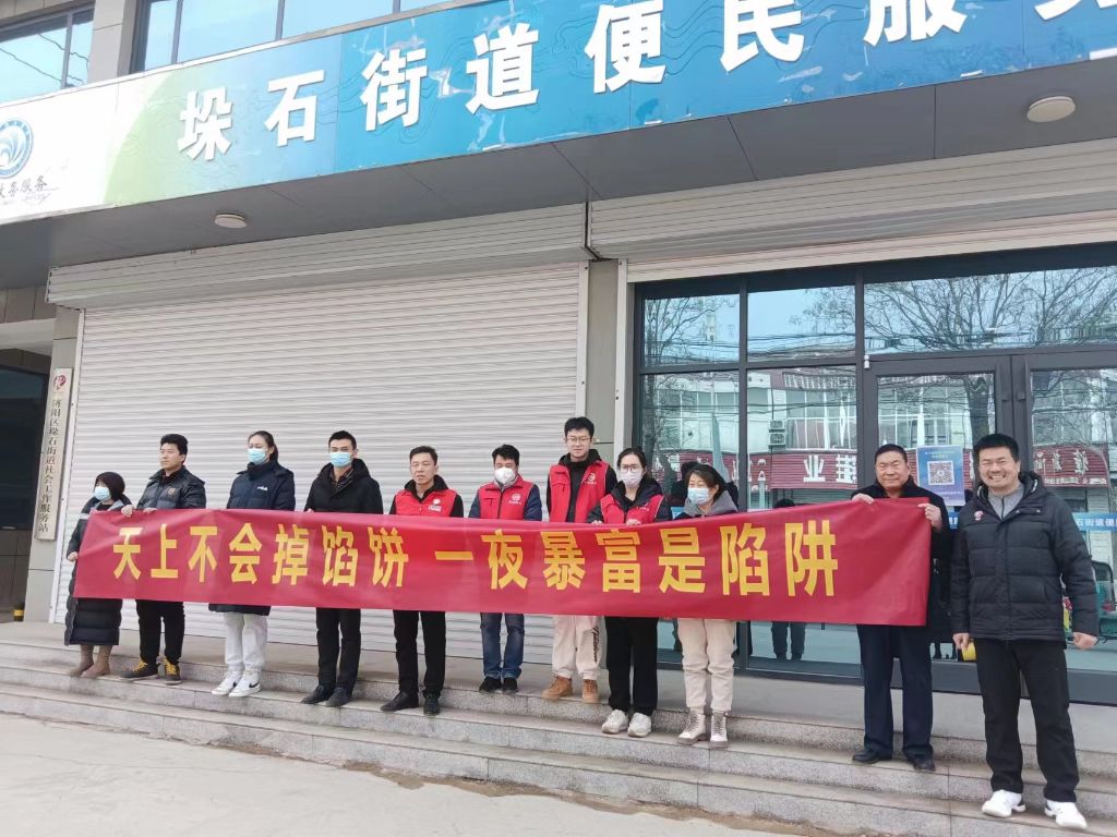 为进一步做好防范非法集资宣传工作,切实保障村民的合法权益,提高村民对诈骗、非法集资等犯罪行为的防范意识,2月10日,垛石街道社工站联合垛石街道司法所,开展以“打击非法集资 共创社会和谐”为主题的防范非法集资集中宣传活动。