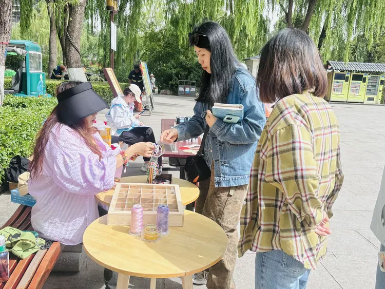 “手工义卖”摊位。县西巷社区的益起爱手工小组制作了不少精美的手链。这些手链全部由熟练的手工艺人精心制作而成,每一条都凝聚着匠人们的心血与智慧。从淡雅的素色到艳丽的彩色,应有尽有,满足了不同人群的审美需求。摊位前人头攒动,一些市民和游客在志愿者们的帮助中纷纷上手试戴并且和志愿者们一起商量着心仪的款式,场面十分热闹。其中一位游客说“这些手链做到了真正的物美价廉!我们愿意买,而且还能帮助公益事业,帮助残疾人,特别有意义!”。
