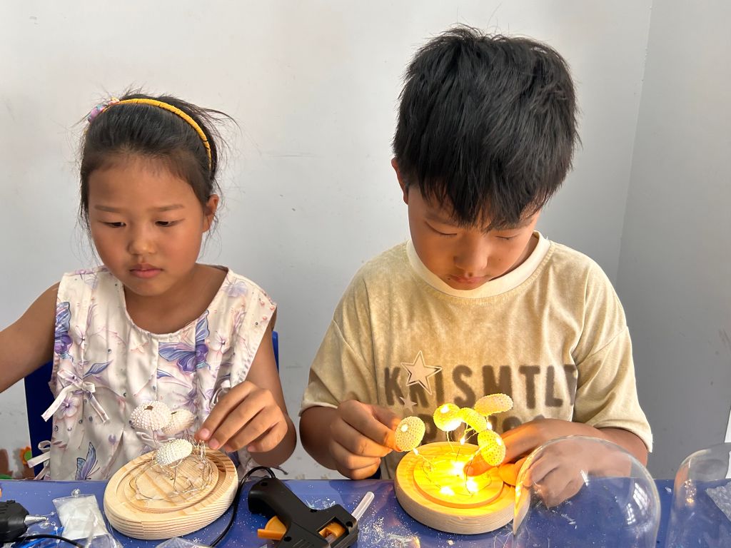 活动最后,孩子们聚集在一起,分享着自己的心得体会。他们谈论着威海的美景,交流着制作水母灯的乐趣,每个人的眼中都闪烁着对海洋世界的向往和对环保责任的认识。