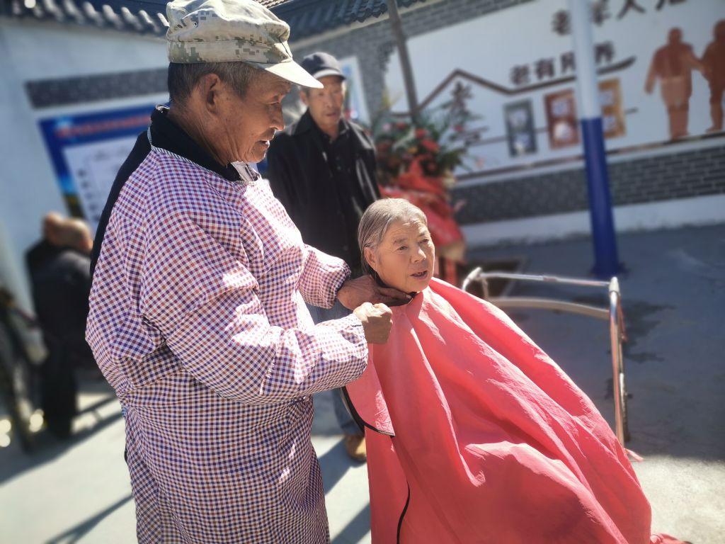 在幸福院的院子里,还有社工招募的剪发志愿者,为幸福院的老人们修剪头发,让老人们在等待就餐之余可以剪剪头发,解决老人们出门理发难的问题,理发后老人们更显的精神抖擞,李大娘直夸:“现在社会对待我们老人太贴心了,谢谢你们啊,姑娘!”。