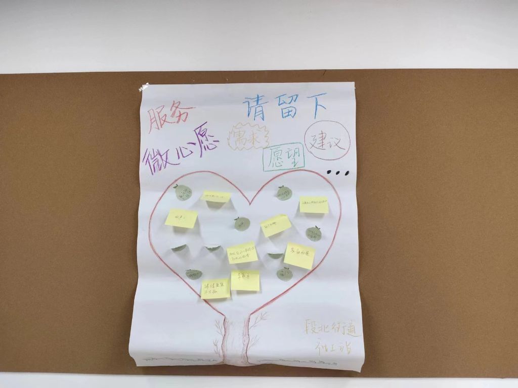 对接精准服务,联动满足心愿。社工通过“服务微心愿”环节,鼓励居民在便利贴上写下自己的心愿、需求以及建议。活动结束,社工收集了几十位居民对社工服务的意见及建议,为社工站建设拓宽了思路,为下一步精准化服务提供方向和依据。