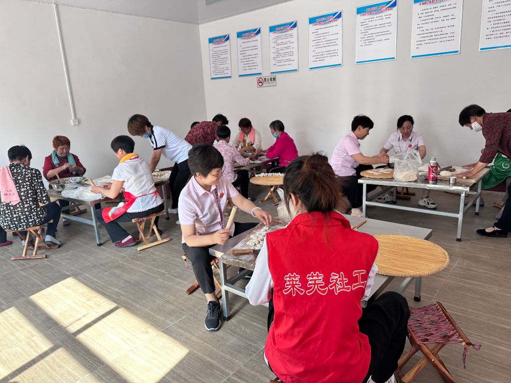 早上一到幸福院,社工和志愿者们就挽起袖子齐上阵,有擀皮的,有包水饺的,有负责摆放的,大家忙的不亦乐乎。
