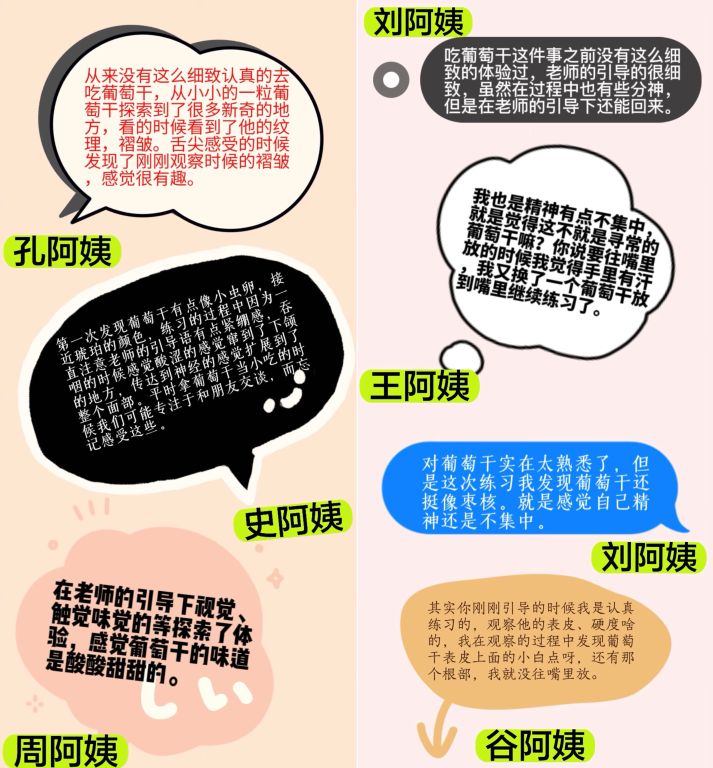 简单的正念饮食小练习完成后,小组组长鼓励和引导大家说出完成练习的感受,小组成员依次进行分享。