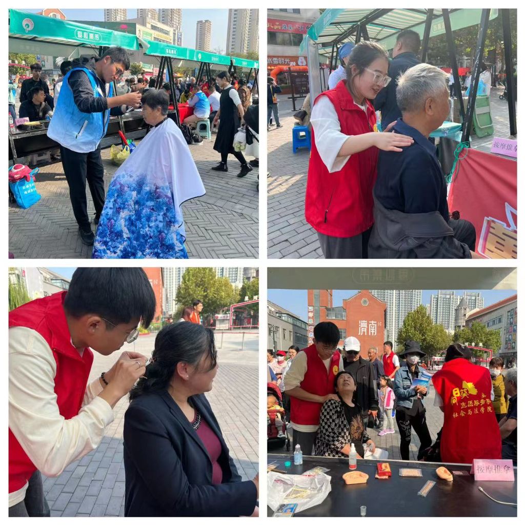集市现场设有健康“益”诊区、法律援助区、便民服务区、政策宣传区共四大区,内含爱心义诊、口腔咨询、法律咨询、养老服务咨询、爱心义卖、认知症宣传、爱心义剪、按摩采耳、投壶体验等共十余项丰富多彩的公益实践项目。活动现场人头攒动、热闹非凡,多支志愿服务队伍汇聚一堂“摆摊设点”,立足于各自的优势特色,运用娴熟的技术为市民提供贴心服务。