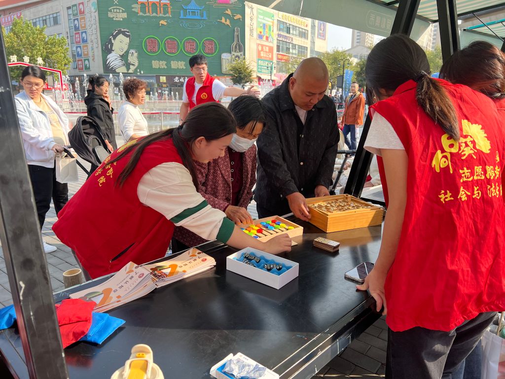 政策宣传区内,由山东女子学院大学生志愿者们负责的认知症宣传摊位前居民络绎不绝,志愿者们将认知症宣传与多种娱乐活动有机融合,依游戏互动的形式对认知症进行宣传讲解,让居民在游戏互动中了解自身健康状况。
