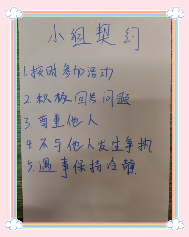活动第二个环节是制定小组契约,社工让组员们围坐一起畅所欲言,并引导组员们互相讨论,共同制定小组规则,最后,在小组成员的一致讨论同意下制定了一份小组契约。明确小组规范,增加小组的凝聚力,使每位成员都能够对自己有更清晰和直观的认识,为之后活动的开展奠定了基础。
