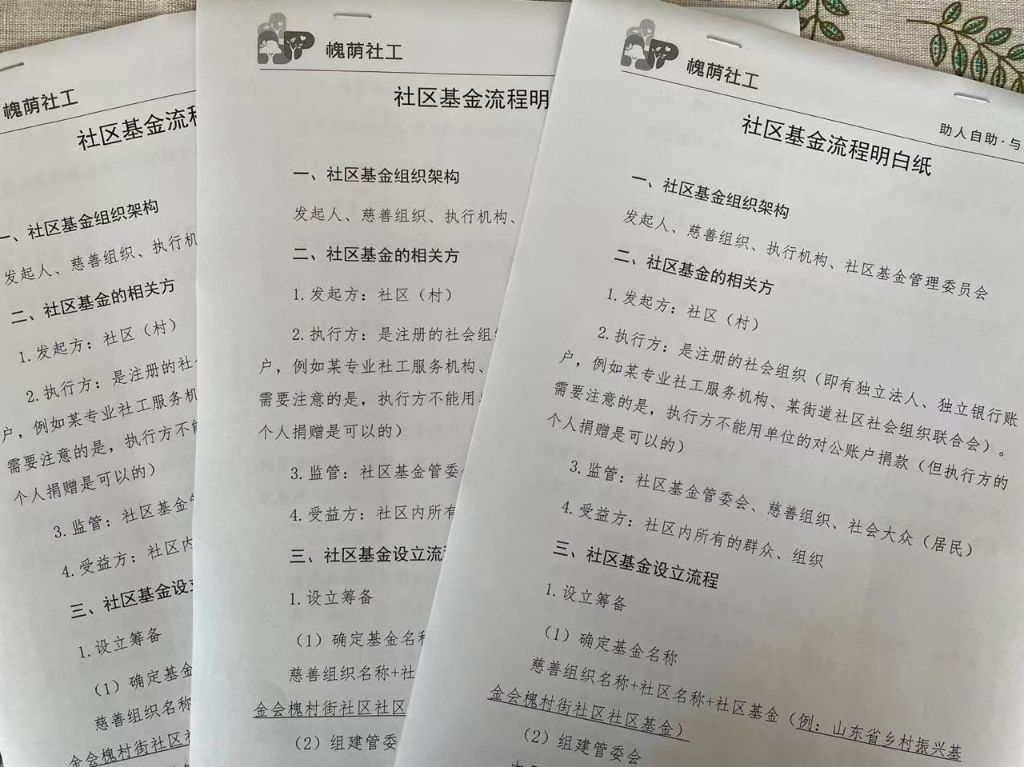 为推动社区基金发展,充分发挥社区基金在整合慈善资源、拓宽慈善渠道、助力“五社联动”、提升基层社会治理服务水平中的重要作用,营市街街道社工站以往调研、社区基金“圆桌派”的基础上,制作了简单易懂的“社区基金流程明白纸”。