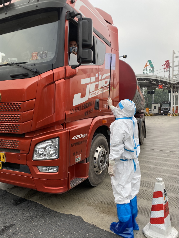 除此以外,社工还参与白云湖高速路口的执勤工作。早上八点到岗,换好防护服后立刻投入工作中,对于每一辆经过的车辆进行严格的检查,请司机按照规定扫描场所码,出示24小时核酸检测报告,并检查其行程卡是否经过高风险地区,依照情况决定对其放行或者劝返。
