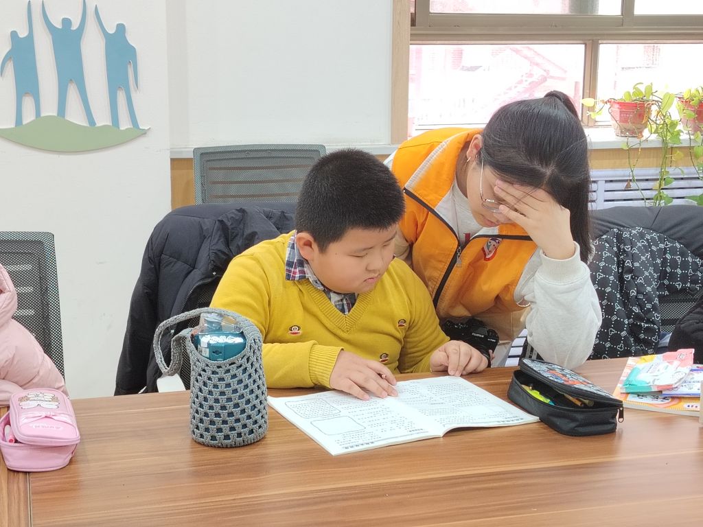 课业辅导环节中,首先社工引导服务对象根据寒假学习内容制定每日学习计划,并将计划落实到学习成长记录中,志愿者老师负责监督计划落实情况,帮助服务对象养成“每日事每日毕”的良好习惯。在执行学习计划过程中,志愿者老师不仅耐心解答服务对象疑问,帮助他们理解和掌握所学知识,还鼓励服务对象主动思考,提高自主解决问题的能力。