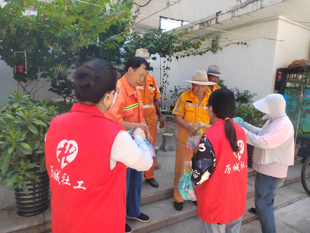 6月18日父亲节来临之际,为表达子女的感谢,也为将感恩之情感染更多的人,洪家楼街道社工站联合洪家楼街道工会、社区社会组织联合会开展“夏季送清凉”暨别样父亲节慰问活动。此次慰问活动对象是洪家楼街道环卫工人们,为了街道的整洁干净,即使是在这样特殊的日子里,他们仍然坚守在环卫一线,为了给他们过 一个难忘的父亲节,洪家楼街道社工站开展了这样一场别样的父亲节慰问活动。