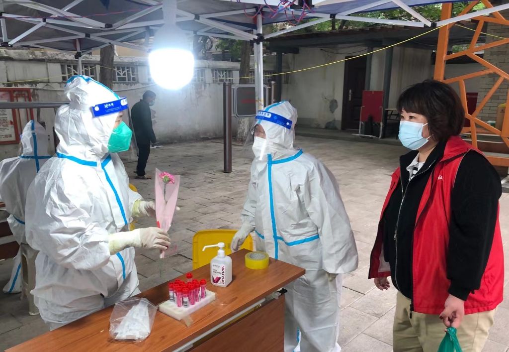在这鲜花盛开,充满生机的五月,迎来了第111个“国际护士节”,为了向工作在防疫第一线、无私奉献的医护人员表达感激和敬佩之情,5月12日下午,无影山街道社工前往翡翠郡社区核酸检测点为他们送上节日的祝福。