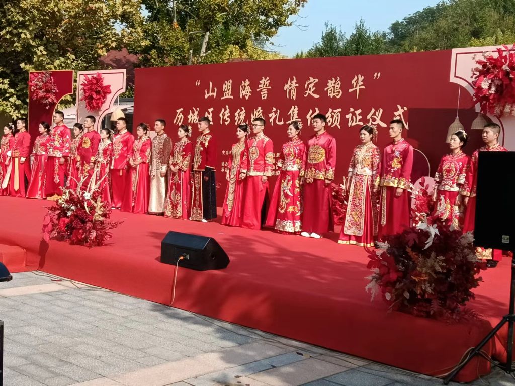 9月28日上午,在这个充满温馨和希望的美好日子里,我们共同见证了一场意义非凡的集体婚礼,这场婚礼不仅是一份情感的承诺,更是华山街道社会工作服务站推动移风易俗、树立文明新风的重要举措。在民政主任的指导下社工们前往华山华阳宫广场,共同参与了这场集体颁证活动。