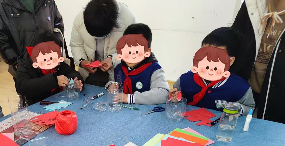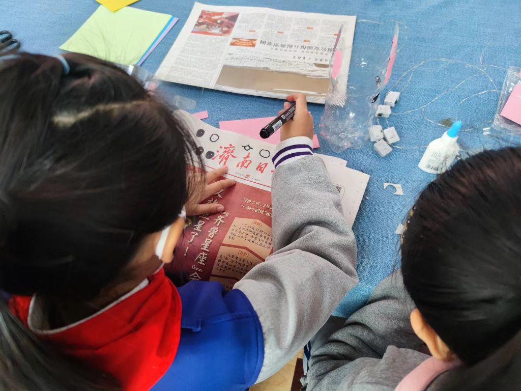 居委会成员和社工早已准备好制作灯笼的材料和工具,为了充分体现绿色环保的生活理念,本次灯笼采用废品制作,比如洗干净的塑料瓶和旧报纸,在孩子们手工制作的过程中穿插环保宣传的环节,起到了寓教于乐的效果。