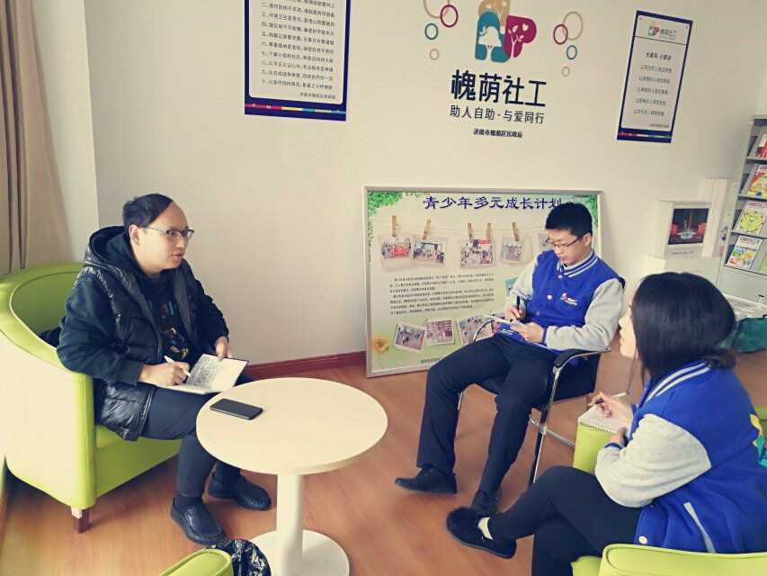 为了更好了解各项目组社工的工作进展状况,2018年12月6日下午,济南山泉社会工作服务社片区主任马庆文走访新映象项目组,并对项目社工进行了沟通慰问。