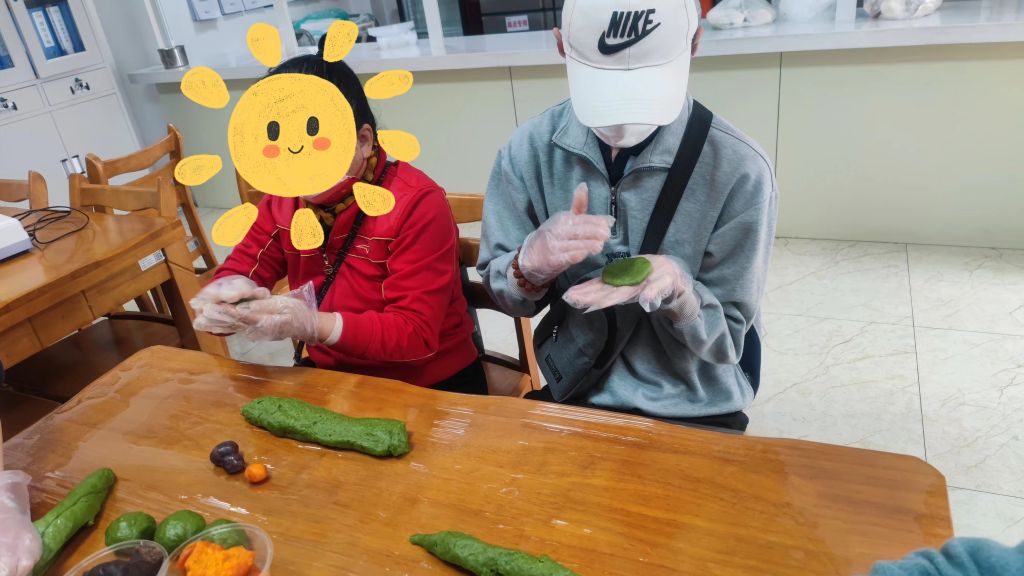 活动伊始,社工向大家简单介绍了清明节吃青团的由来,接着社工将制作青团所需的各种材料摆放在餐桌上,并向大家展示了青团的制作过程。现场气氛立刻活跃了起来,大家主动请缨,卷起袖子,开始捻青、和粉,社工将面团分成几个大小相似的小剂子,大家将其逐一压出一个空心的凹坑。接着,他们放入适量的豆沙馅、肉松馅和紫薯馅,并用虎口捏拢封口,搓成球状。不一会儿,大家就制作完成了一个个外形漂亮的团子。