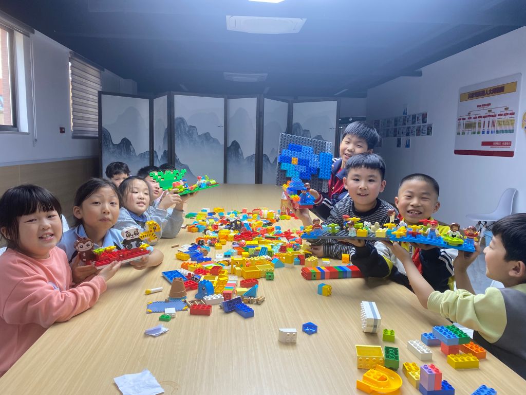 在拼搭过程中,儿童们先是开动脑筋思考拼搭内容,米部落选择拼搭白菜,鱼部落选择拼搭一条鱼,兽部落选择拼搭一块肉、禽部落则选择拼搭有很多只鸡鸭的农场。确定拼搭内容后,各个部落的儿童分工协作,有的儿童负责找相关颜色的积木,有的儿童负责拼搭,同部落的两人时不时还会碰撞出新点子,例如:立体的鱼不好拼搭,可以先组成一个底板再进行平面拼搭。拼搭结束后,社工询问米部落最想拿白菜和哪个部落交换,米部落表示想和禽部落进行交换。随后社工又询问禽部落想和哪个部落进行交换,禽部落表示想吃鱼,要和鱼部落进行交换。在社工询问的过程中,儿童们也感受到了物物交换的麻烦之处,理解了货币产生的原因。