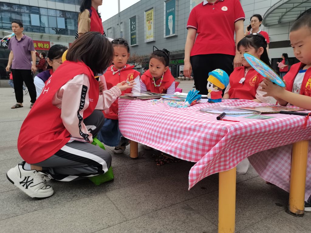 精心策划准备,招募爱心伙伴。为了活动能顺利开展,社工在前期做了很多准备工作,活动当天要义卖的“商品”一部分是康复中心的孩子们制作的,虽然他们动作有些慢,但孩子们都很认真,作品也很精致。前来购买“商品”的人们,都被他们的心灵手巧所折服,被他们乐观面对生活的精神所感动。而另一部分来自爱心人士的捐赠,社工和志愿者在前期进行大量的宣传,呼吁爱心家长带领自己的孩子积极报名参加。活动现场,有20多名小小志愿者参与进来,他们纷纷拿出看家本领,桌子上摆满琳琅满目的“商品”。女孩们编了好看的手串项链,画了好看的雨伞;男孩们做了风筝和扇子等。