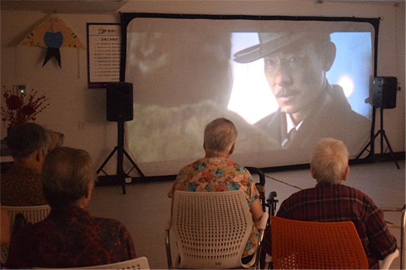 社工通过走访喜爱看电影的住养老人,了解到他们大都很喜欢与近代历史相关的电影。于是,社工链接山东省广播电视局为老人们播放了电影——《建党伟业》。