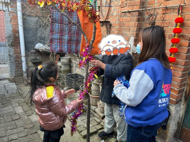 (青合站社工与服务对象一起装扮小院)