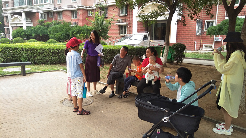 上午项目组社工、济南大学实习生与社区小志愿者携带宣传展板、宣传册、暑期计划表等来到阳光花园东区小广场,路过的业主纷纷驻足咨询。随后,项目组社工移步至阳光花园西区小广场进行宣传,考虑到西区人员较为分散,项目组社工和小志愿者分头,在西区各个出口定点宣传,吸引社区中“带孩”家长了解社区中暑期青少年计划与方案。