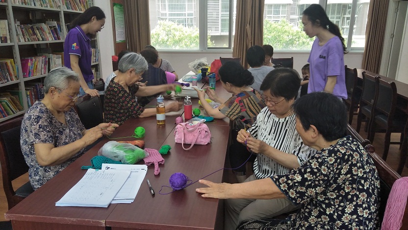 社工先介绍了手工队的情况及课程内容,并对到来的居民表示欢迎,随后引导志愿者帮助大家学习针织技艺。针织生活用品是老一辈人年轻时的独特记忆,虽然多年没碰钩针,经手工志愿者指导,大家手头上的技艺也愈发熟练,昔日生活的记忆也愈发清晰,开始与大家分享着独属于他们年代的故事。大家欢声笑语,消解了日常做家务的疲乏,增进了了解,建立了良好的关系。高龄老人们也不甘落后,学习的精神十分高涨,认真的请教,虽不比年轻人灵敏,但却喜笑颜开,乐趣无穷。