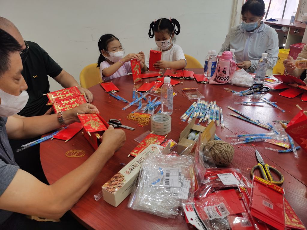 灯笼制作过程中,大家互帮互助、互相关怀,“你剪红包我来串”“你剪竹签我来扎”……大家相互欣赏着,相互鼓励着。在互相协助下,一盏盏富有创意的灯笼制作完成。大家看着亲手制作好的灯笼,脸上洋溢着自豪与喜悦的笑容。