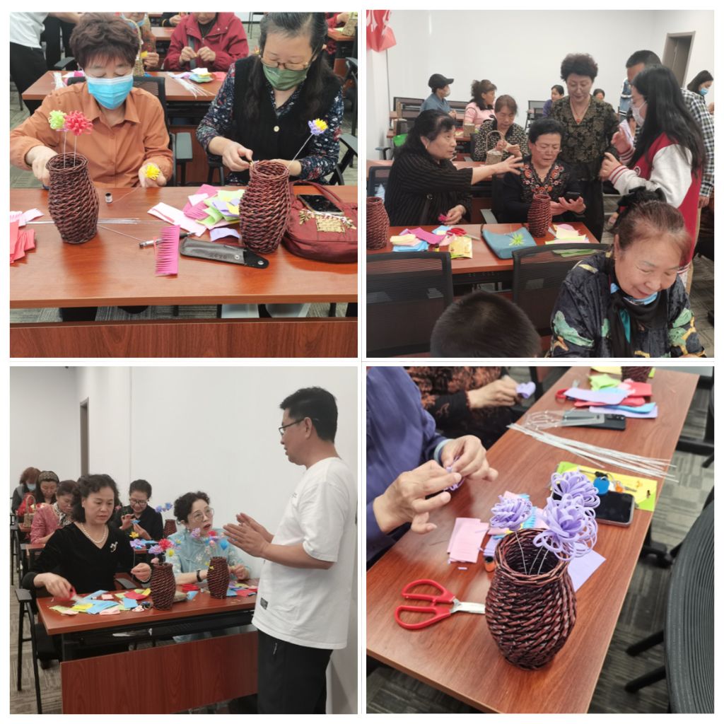 活动伊始,由志愿者献上了一段葫芦丝吹奏表演开场,随后社工邀请老年大学的讲师现讲解了一些手工花制作过程中的材料、步骤、制作方法和注意事项,社工分发材料之后,居民们就开始争先恐后的动起手来,一双双灵巧的手在剪、折、贴、粘等操作后,一束束精美的手捧花“绽放”开啦!看着自己亲手制作的作品,大家互相讨论着学到的技巧,相互展示,分享着成功的喜悦。