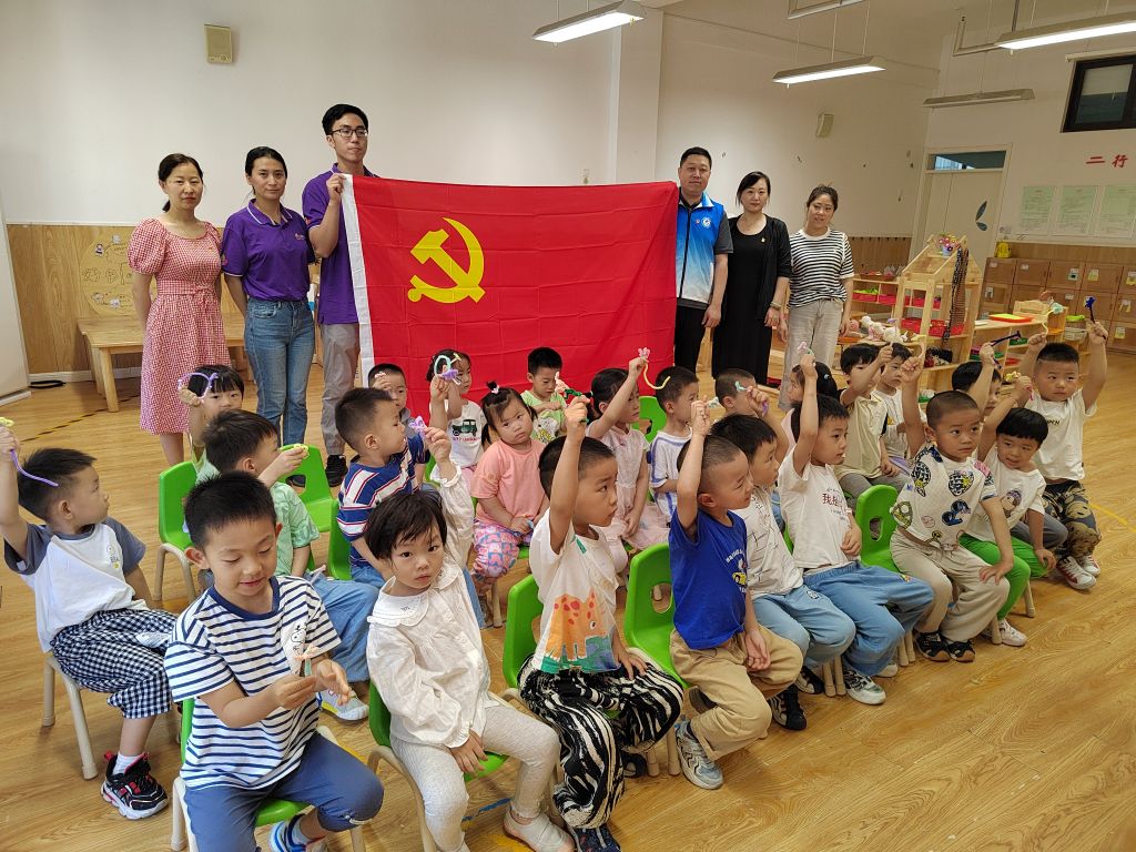 孩子们将自己的小花献礼给党旗,并与党旗合影