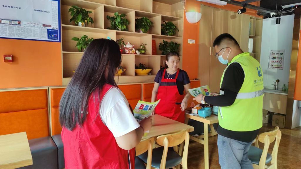 滨河左岸社区位于商业街中心位置,沿街饭馆、超市、门诊比较多,每天都会产生大量的生活垃圾,社工针对辖区内沿街商铺进行垃圾分类宣传倡导,发放活动单页,为大家讲述垃圾分类知识以及每天产生的四大类垃圾应该如何准确投放,并设置几个小问题进行现场检验(过期药品属于什么垃圾,应如何进行投放呢?餐饭剩渣属于什么垃圾呢?)。最后,社工号召大家积极加入到垃圾分类的大军中来,从自身做起,影响身边人。