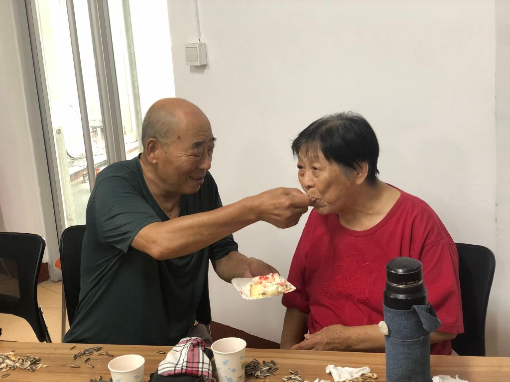 第二项节目是拍夫妻合照,社工邀请每一对叔叔阿姨来到前台,并特意邀请了照相馆的专业摄影师为大家合影留念。阿姨手捧花束,开心的依偎在叔叔的身旁,几十年风雨同舟 相濡以沫的感情在此刻有了具象化。