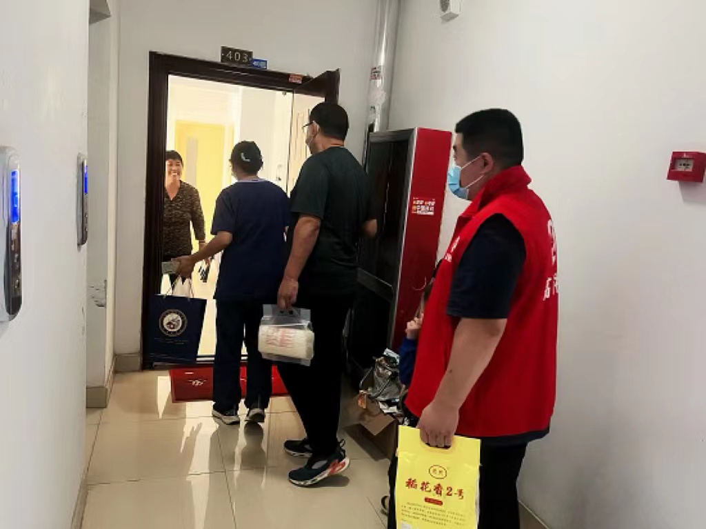 ▲街道民政办公室负责人王美玉、街道社工、社区养老机构专职人员敲门送“关怀”