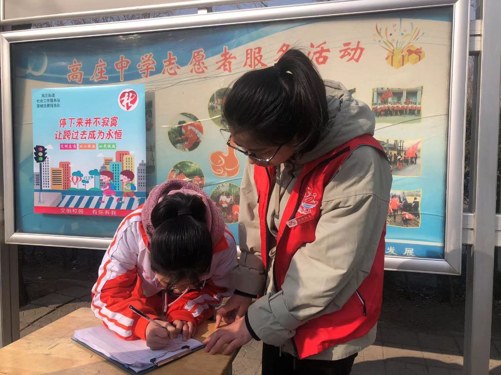 招募活动在高庄中学内举行,9:40待学生大课间内,高庄街道社工通过张贴海报的形式,向学生介绍社区志愿服务内容及参加志愿服务的意义,鼓励大家加入到志愿者队伍中来。学生报名志愿者气氛热烈,现场老师纷纷表示赞成与支持,社工协助学生现场填写志愿者报名登记表。