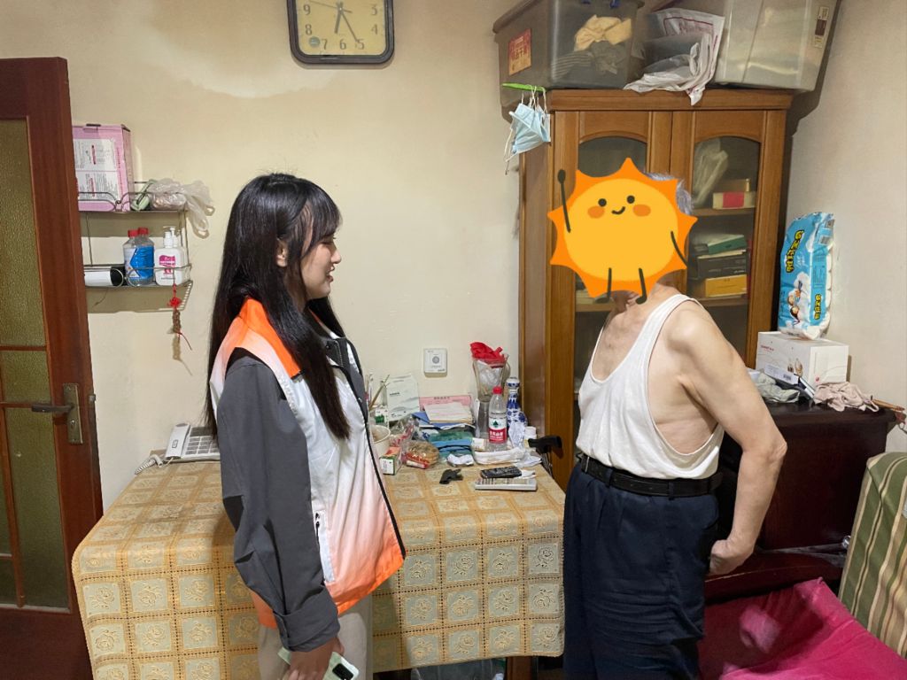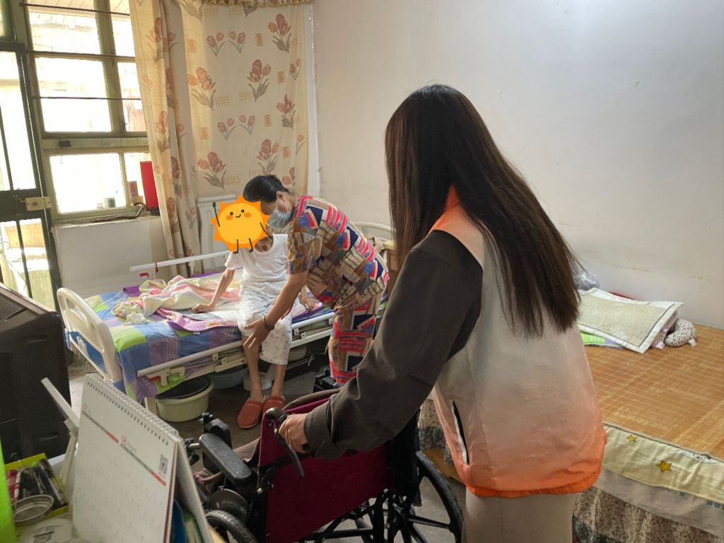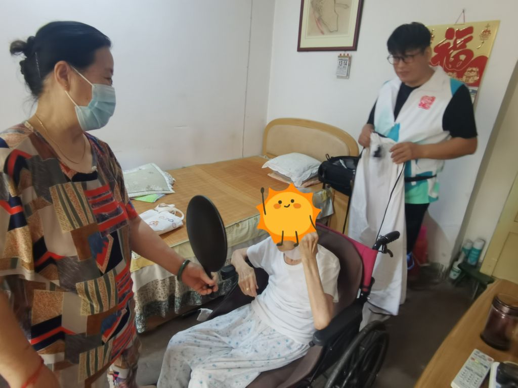 来到长盛南区社区,社工与服务对象杨阿姨的女儿亲切交流,了解服务对象的身体健康状况、生活起居、家庭成员信息;通过访谈初步评估照护者的心理压力并引导照护者运用倾诉、冥想等科学健康的方式宣泄情绪,同时借助社区、社工站、志愿者等多方力量为家庭提供支持和帮助。随后,社工来到服务对象的床边,与照护者一同将服务对象抬至轮椅上接受理发服务,端详着镜子中焕然一新的发型,95岁的杨阿姨为社工和志愿者竖起了大拇指。