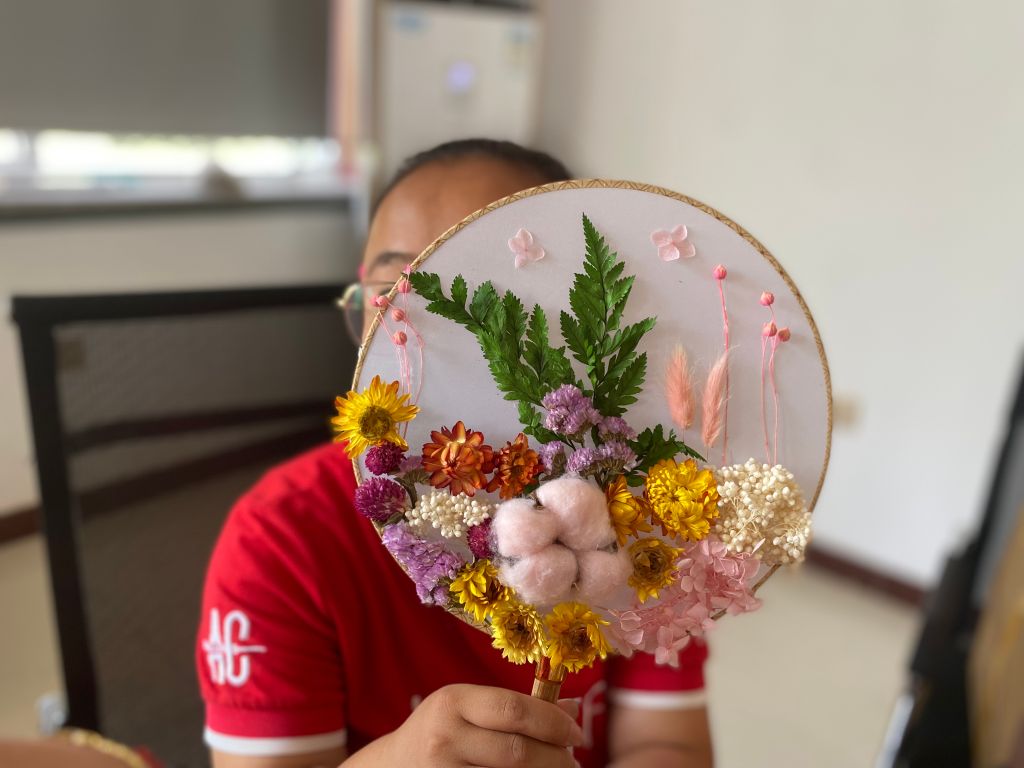 手工环节,炎炎夏日,扇子可以带来一丝丝清凉。社工精心准备了DIY团扇所需要的材料,讲解制作团扇的流程,让残疾人朋友自己创作。大家在拿到材料工具时一致认为这项手艺较难,很怕自己学不会。社工依据他们学习的速度将他们分为三组,同时在一旁指导,进行合作制作团扇,大家兴致很高,纷纷加入到动手制作的过程中来。