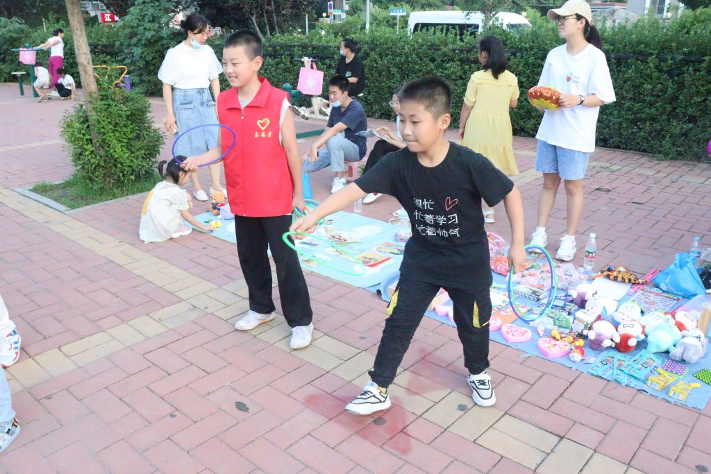 随着傍晚出来散步的人越来越多,公益集市活动现场人声鼎沸,孩子们的叫卖声、讨价还价声交织在一起,“小摊主们”积极地向过往的叔叔阿姨推销着自己的商品,“新华书店正品,原价三十,现只要几块”……孩子们学着大人摸样用心经营着自己的生意,周围路过的大人也被这景象吸引,心甘情愿地掏出钱包。在众多摊位中,最火爆的摊位要属套圈了。地垫上摆放着多种多样引人眼球的小玩具,小摊主们和家长志愿者们卖力吆喝,很多孩子看到别的小朋友不费吹灰之力就套中了自己心仪的玩具,也摩拳擦掌想试一下,而有的孩子抱怨“就差一点点就套到了”,争抢着再来一次。